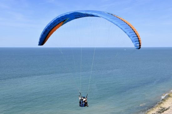 패러글라이딩을 즐기는 모습입니다. 아름다운 바다 위에서의 비행은 많은 이들에게 꿈과 같은 경험을 선사합니다.